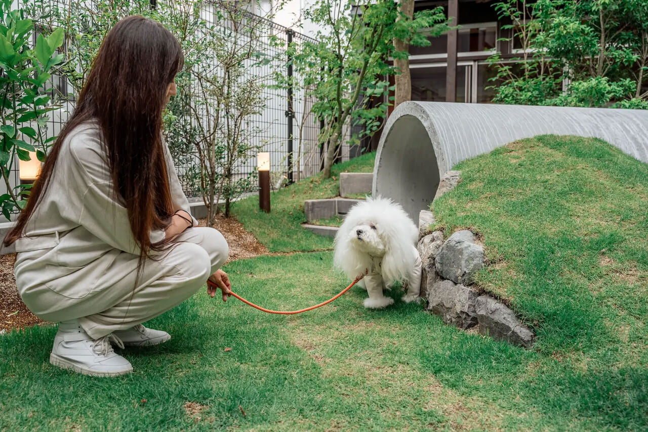 敷地内には天然芝のプライベートドッグランを完備。館内は落ち着いた雰囲気で統一されており、日常の喧騒から離れた、穏やかでゆったりとした時間をお楽しみいただけます。