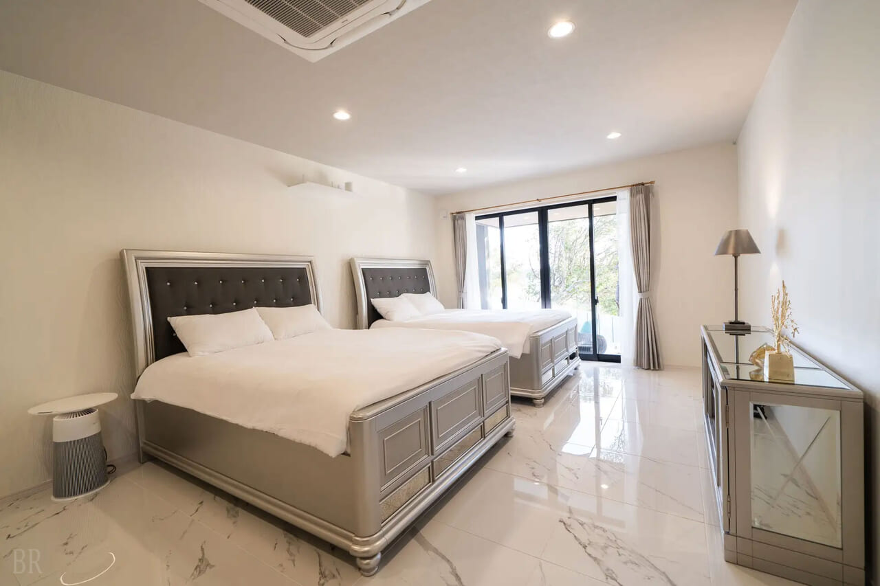 プライベートプールやサウナを備えたガーデンテラスを含め、400㎡を超える広大空間の当ヴィラは、最大10名までのご宿泊が可能。大人数でも悠々と過ごせ、開放感のあるダイニングと2つの独立した寝室を備えており、二世帯での家族旅行やご友人同士でのご旅行にもおすすめです。