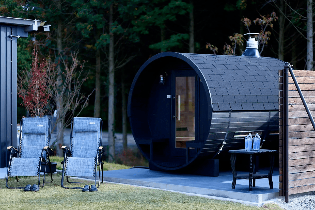 「茜色の夕陽」の客室には、木の温もりと心地よい香りに包まれる本格バレルサウナを完備。